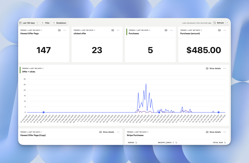 Use the Web Analytics tab for quick marketing snapshots. Use custom dashboards when you need filtered cohorts (only users with emails), combined product and marketing data, or charts that don’t exist in the default view.