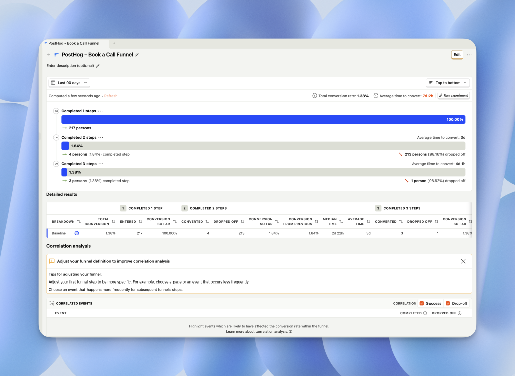 Set up a funnel from pageview to purchase, then scroll to the Correlations section. PostHog automatically surfaces which user properties or events correlate with conversion. This replaces hours of manual SQL. If you store user tiers or acquisition sources as properties, correlations show which segments convert best so you can double down on what works.